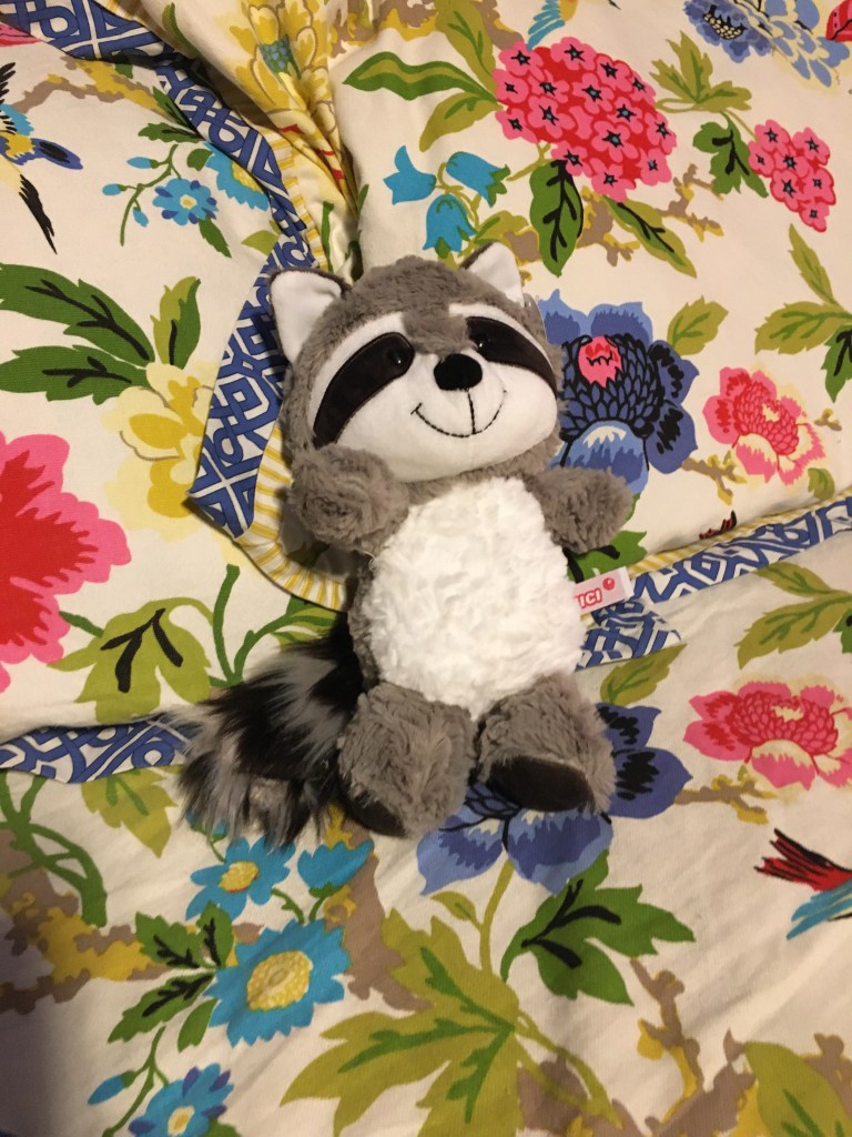 Boss lady sent me a Christmas prize today. A box of goodies with a stuffed raccoon inside. She has a raccoon story, too. Placed the raccoon on my bed, named him Rocky, and threatened Penelope to not even sniff him.
