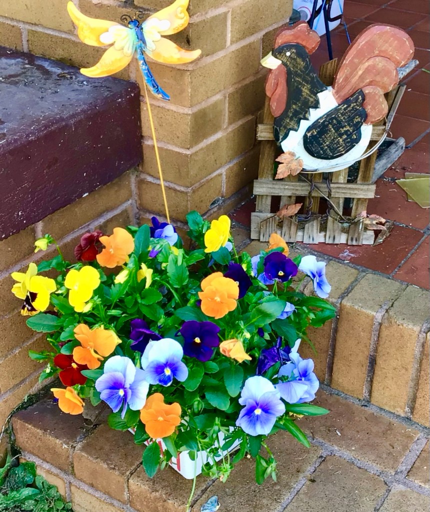 My pansies are beautiful, standing straight up saluting Mother Nature in thanks for the last few cool nights and mornings. They’re not going to make it much longer. Gonna dig them out of the urns and plant them in a shady spot by the oak tree and see if they’ll bloom a little longer. Guess I need to head to the local feed store and purchase some petunias for my urns. The petunia that is growing in the crack on the step has five blooms on it. Determined little fella!