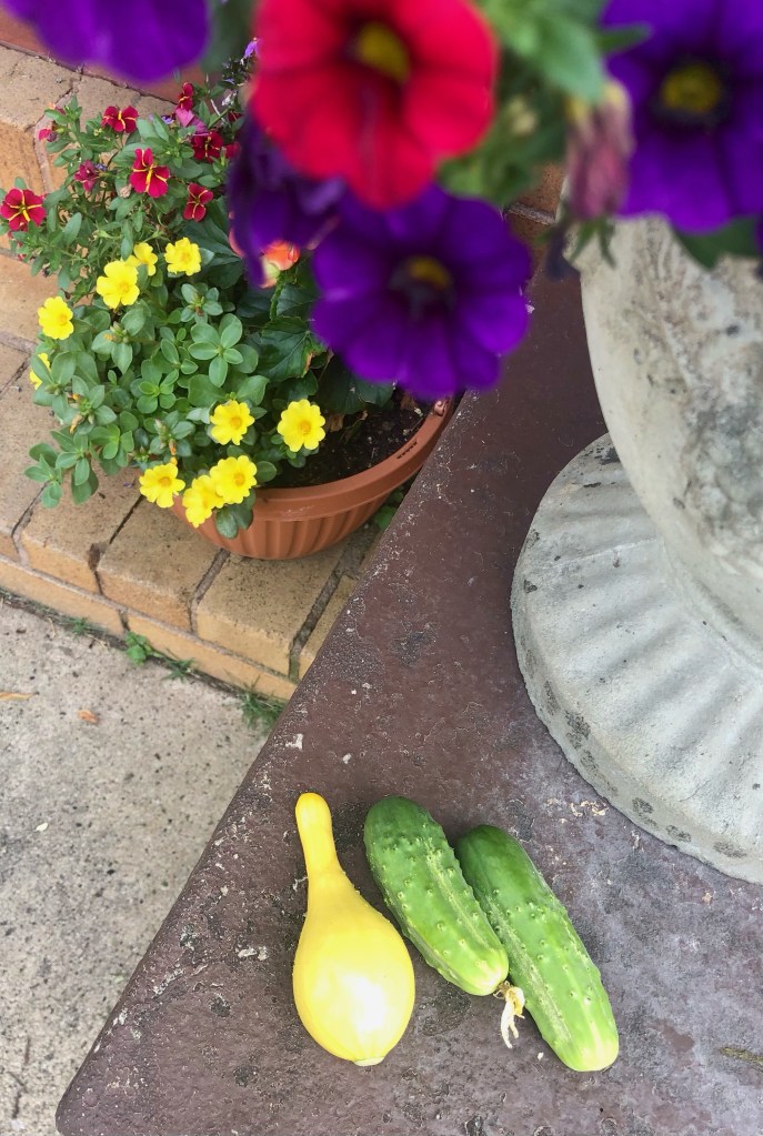 My first harvest from my vegetable pots’ garden! Ate the cucumbers soon as I picked them! So delicious!
