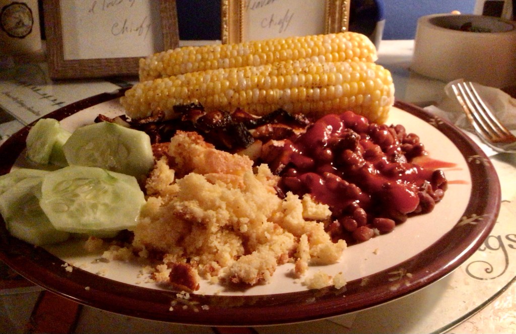 Had my first fresh garden vegetable supper tonight. Corn, squash, new potatoes, peas, and cucumbers. So good but the cornbread stuck in the skillet. Chief always said when the cornbread crumbled it meant it would taste delicious. It was! Can’t remember the last time I made cornbread…probably in the winter when I made homemade soup. When Chief was alive we had biscuits or cornbread every night. That’s another depressing point of widowhood. It even changes mealtimes and what you cook. Haven’t had a biscuit since the last time Thomas and his family spent the night in May.