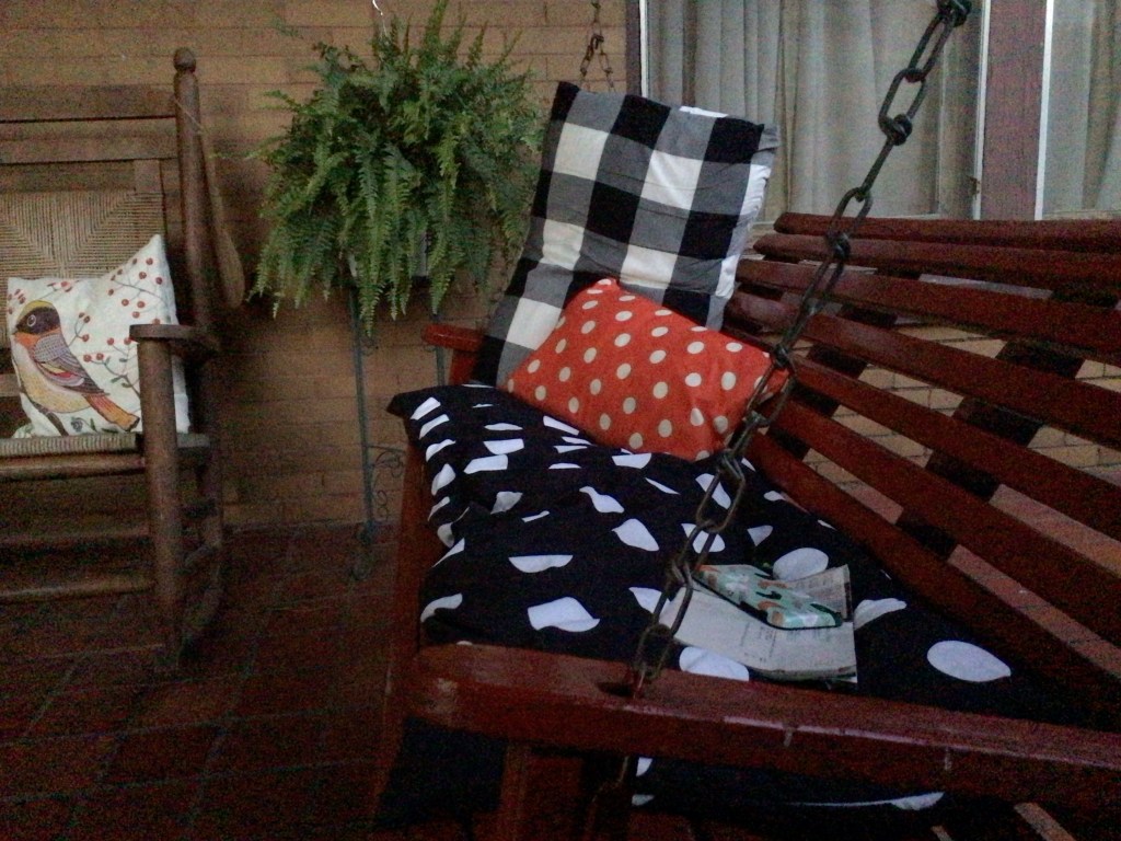 The porch swing brings me so much pleasure. It is so comforting to me to sit and relax and wind the day away watching the world turn on its axis. Guess the beauty of a porch swing is the connecting with the stillness of nature for me. I love to just sit and watch the cloud formations and the birds at the feeders and all the neighborhood cats and dogs wandering on their daily jaunts. I count my many blessings. The world passes by and I watch from my perch in the porch swing. I’m swinging now, usually sit with my feet up, but the breeze is so cool and the swinging is conjuring up all these memories associated with the porch swings.