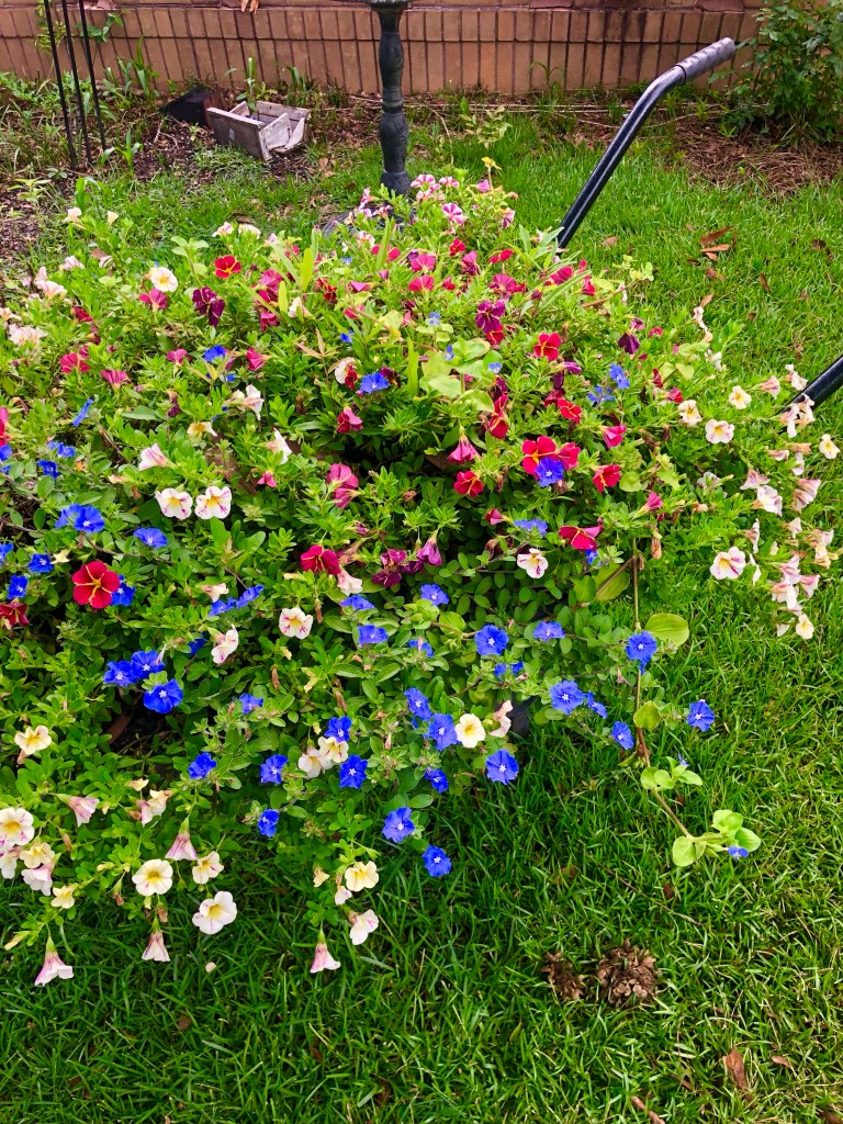 The feeders were full of cardinals and finches and titmice late afternoon. The downy woodpeckers were enjoying the suet baskets. They all had a refreshing shower in the rain. I watched the birds on the feeders during the rain storm. They were seemingly oblivious of the rain, eating sunflower seeds and shaking the water droplets from their wing feathers. I know it felt good to them, cooling down after the humid hot morning. Two cardinals sat on the handles of my old wheelbarrow full of millions bells. So pretty, but of course they flew off right as I took the photograph.