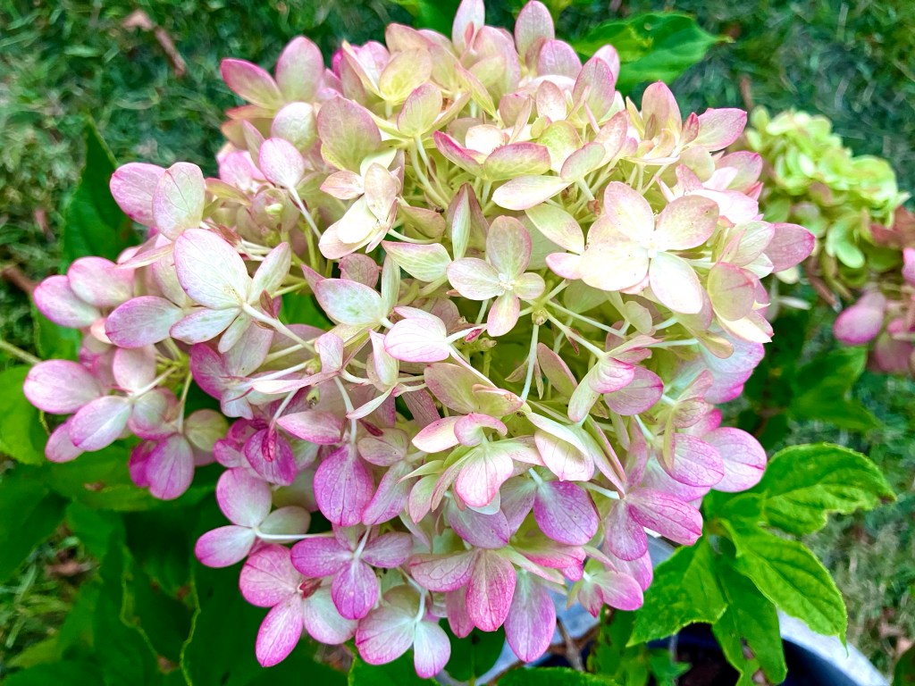 My limelight hydrangea, heavy with rain, has 22 blooms on it. So beautiful with its blossoms of pistachio green. The blooms are bent over as if they are praying for some first day of summer sun. I haven’t planted the hydrangea in the yard yet, I just sat its pot down in my daddy’s huge old pressure cooker and it’s thriving. Well, it was thriving but the new neighborhood dog just peed on the biggest bloom. Bad dog! My grass is the prettiest lime green color, glistening in the rain. The green grass and the limelight hydrangea blooms are so beautiful in their contrasting colors.