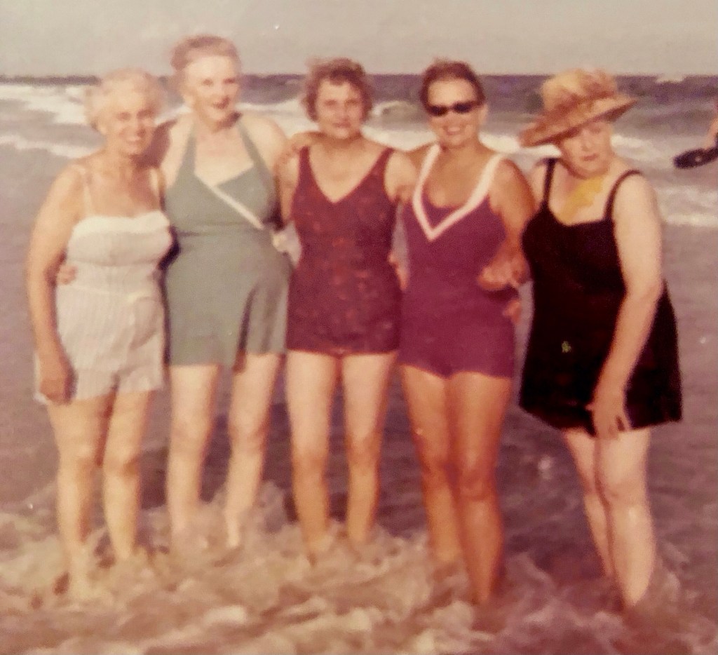 My grandmother Margaret Lane (at right), with the fancy straw hat, on the beach in Pensacola, Florida, with her friends. We called her “Big Ma.” Always thought she was old in this photo but she’s only one year older than I am now.