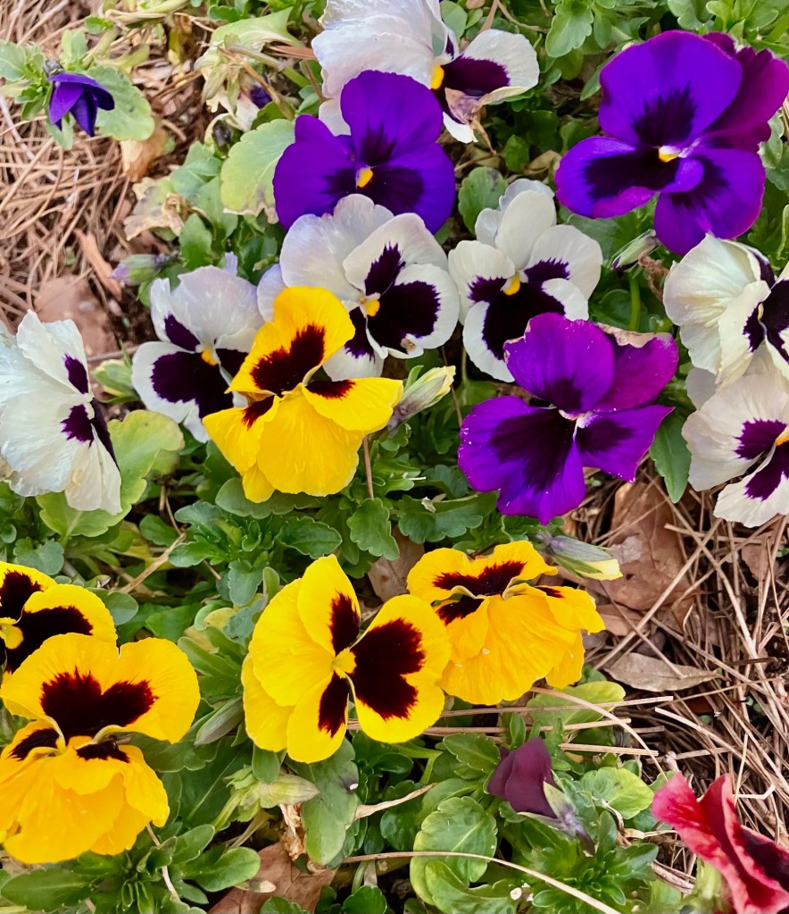 I saw a yellow butterfly flitting round the pansies mid-afternoon. The pansies are just glorious with the sunshine kissing their petals. Pansies remind me of little old ladies with timeworn smiles, skinny with smoky grey hair, dressed in a shirtwaist, sensible square toed shoes, strapped and low heeled, little paten leather purses resting on the crook of their arms, beauty parlor born every Saturday so their curls stay till church on Sunday. And they probably sit on their same pew every Sunday and don’t want to see you in their seat when they walk down the aisle. Nothing turns that grey hair red faster than them walking down the church aisle seeing you occupying their pew. Trust me, been there and done that, complete with the look and the talk.