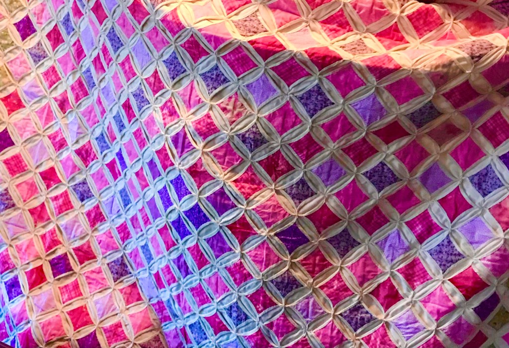 This quilt has been such a comfort to me for almost 50 years. I carried it off to college and put it on the foot of my bed. It covered me up when I was sick and kept me warm in the winter. Helped heal my hurts when I was homesick for my family. I would take it to the beach and to the lake and use it as a beach towel to sunbathe on. When I got married I used it for a curtain in the bathroom of our first home. When our children came along they all learned to sit up and crawl on that quilt. I’ve even used it as a table cloth on birthday occasions. It’s old and used and worn and has been in the washer and dryer several times but I love it and all the memories I associate with it.