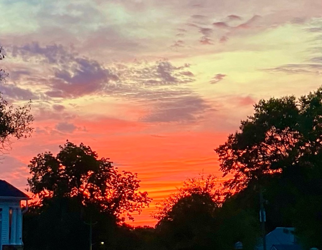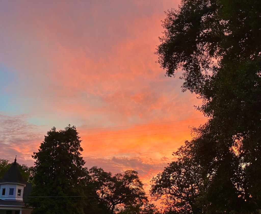 Last night Mother Nature’s paint brushes created a sumptuous sunset pageant in shades of hot pink and purple. She brushed a watercolor wildfire across the horizon that ran down the street in my neighborhood and exploded behind my neighbor’s house in a profusion of hot pink. I’ve never seen such a glorious painting. Mother Nature painted streaks of yellow through the hot pink and colored the high clouds a light purple. The sun rolled down the horizon as a ball of fire as the wildfire of sunset peaked then slowly faded away. The twilight was in awe of the sunset and slowly cast her shadows of night across the neighborhood. The fireflies had watched the sunset and still entranced were slow to perform their light ballet. Father Sky hung the luminious moon and the twinkling stars, all talking of the wondrous painting of sunset. The day ended gloriously and the night began silently.