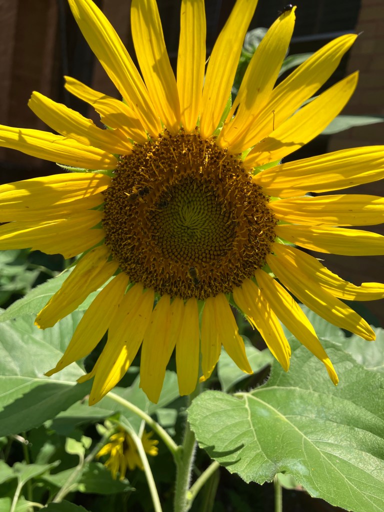 All my struggling tall sunflowers had finally stood back up yesterday but Mother Nature stormed through the garden last night and knocked them down again. A crayon yellow male goldfinch sat on one of the blooms around dusk today, plucking out the seeds in the yellow pedaled dark bloom, a wonder to see. So beautiful to see all the birds’ colorful plumage contrasting with the beauty of the yellow sunflowers. I love sunflowers and so do my songbird friends.