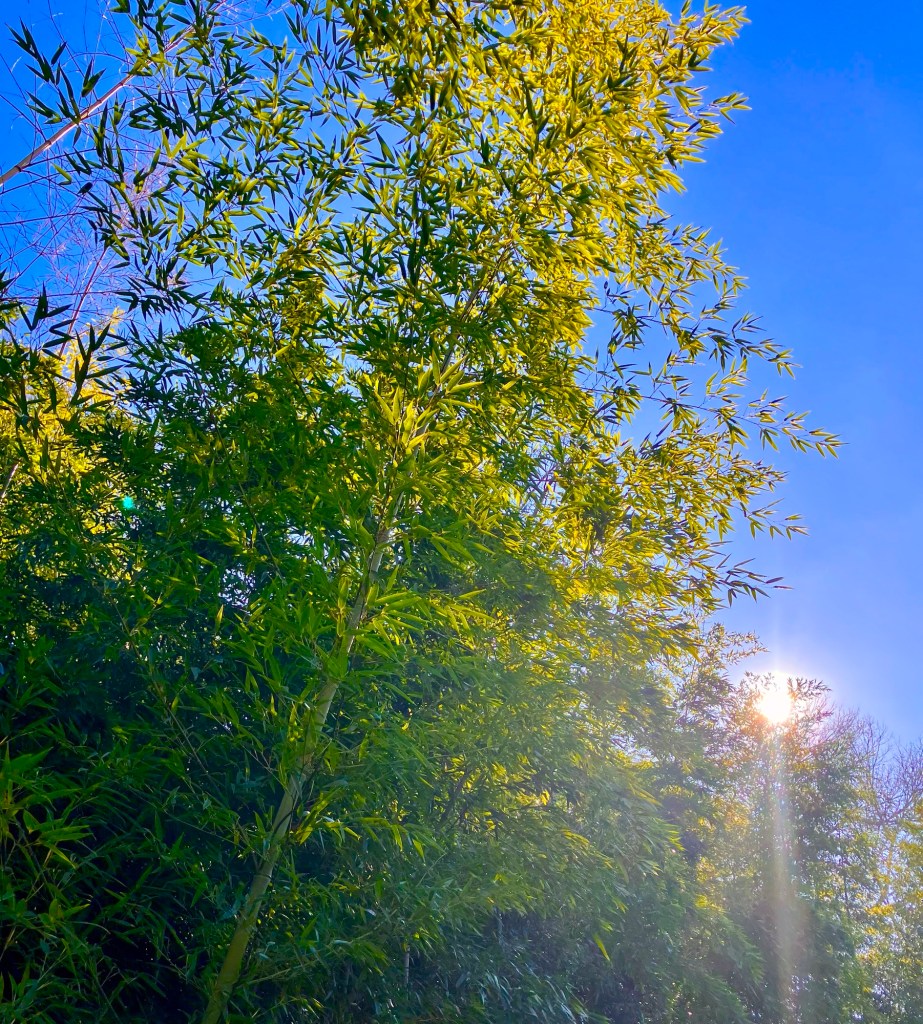 The sun streams through the bamboo highlighting its leaves and trunks.