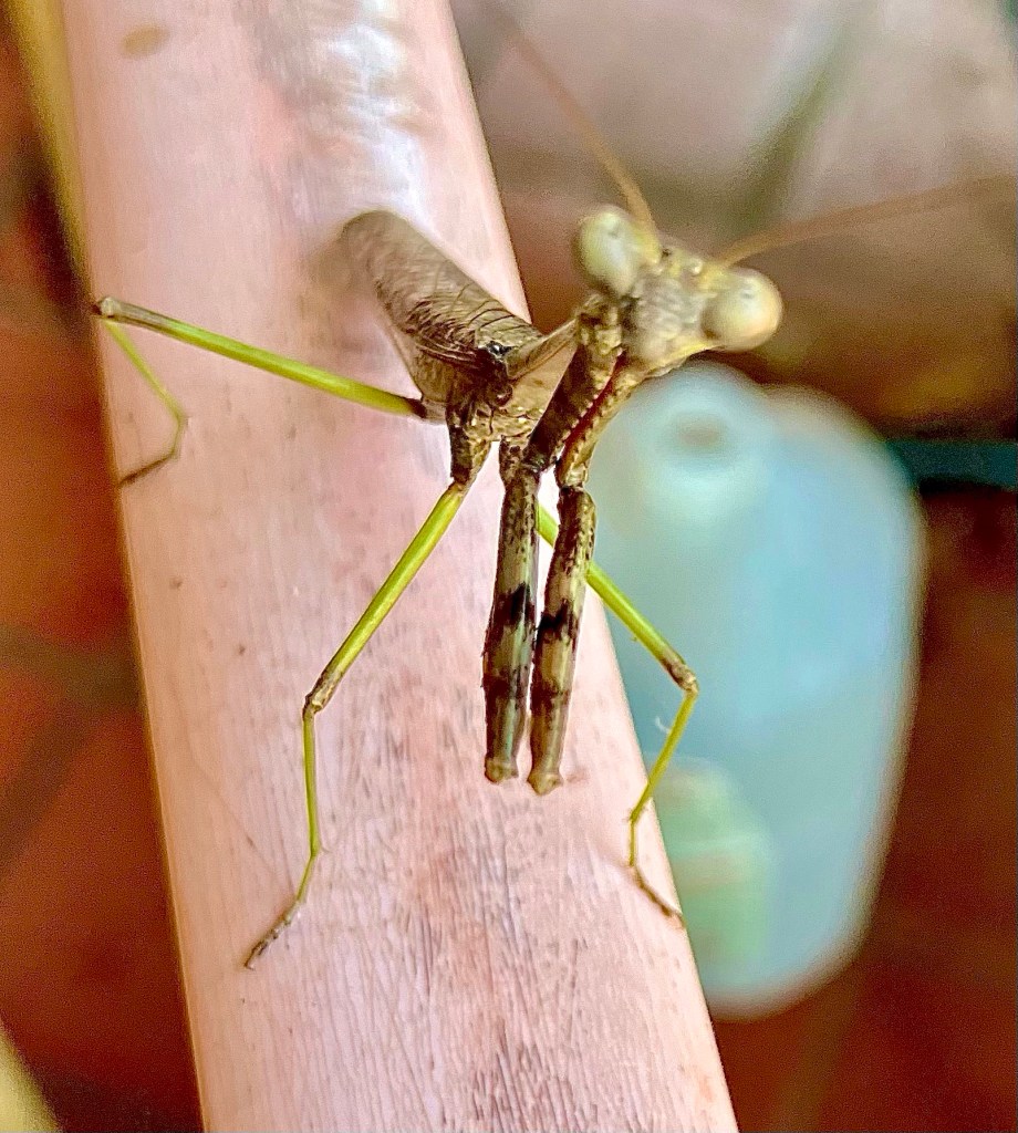 My day is pretty with a brisk heavy breeze. I’m enjoying the wind chime symphony as I perch in the swing and bird watch. A red breasted grosbeak, dressed in jet black and snow white plumage, with a vest of reddish-rose, visited my yard this morning, such a handsome bird. Hope he brings a flock of his friends with him tomorrow. A praying mantis stopped by to do a little praying on Penelope’s playpen as he walked around the top bar. I took a few photos before he flew off. I never knew a praying mantis could fly.