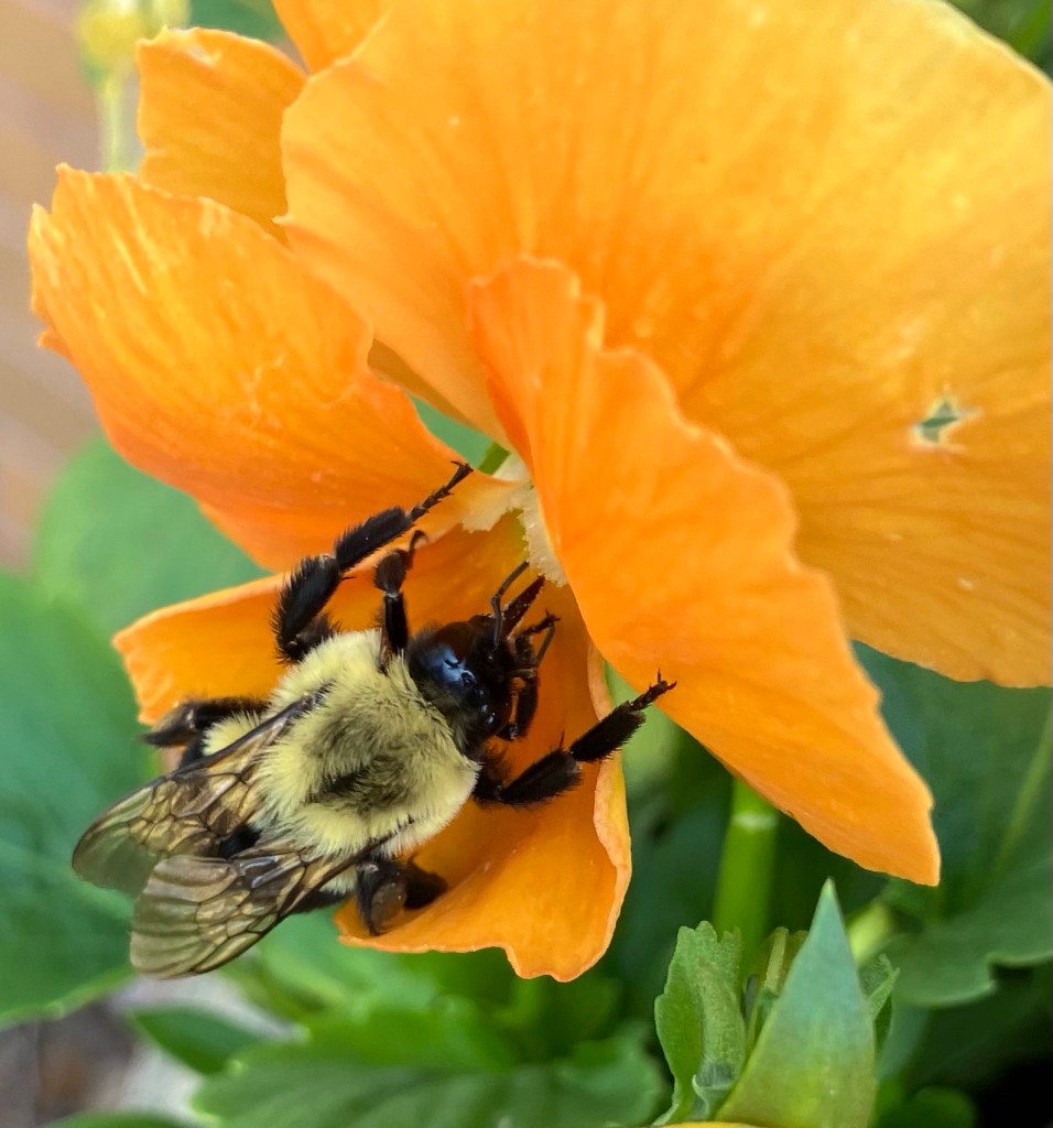 Today is so pretty and sunny, the last remnants of summer playing out in my yard. I’m watching all the bees buzzing around my pansies, taking photos of those kind enough to not fly off when I approach them. The colors contrasting between the bees and the pansies is just as beautiful as the butterflies dancing on the zinnias. There is one yellow zinnia bloom left and I chased a cloudless sulphur butterfly around that bloom but it never stopped to dance. I wanted to capture the yellow of the butterfly with the yellow of the zinnia. I’ll try again tomorrow. I’m enjoying watching the bees this afternoon. They’ve been very patient with me and my camera.
