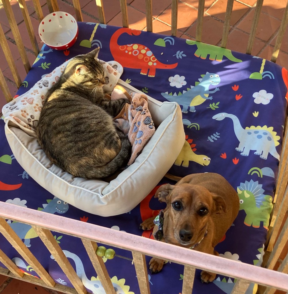 She just tolerates her. We just came in the house from the porch and the cat was in the bed in there. They both stayed in the pen a long time this afternoon, neither one in the bed🤓. Happy evening!