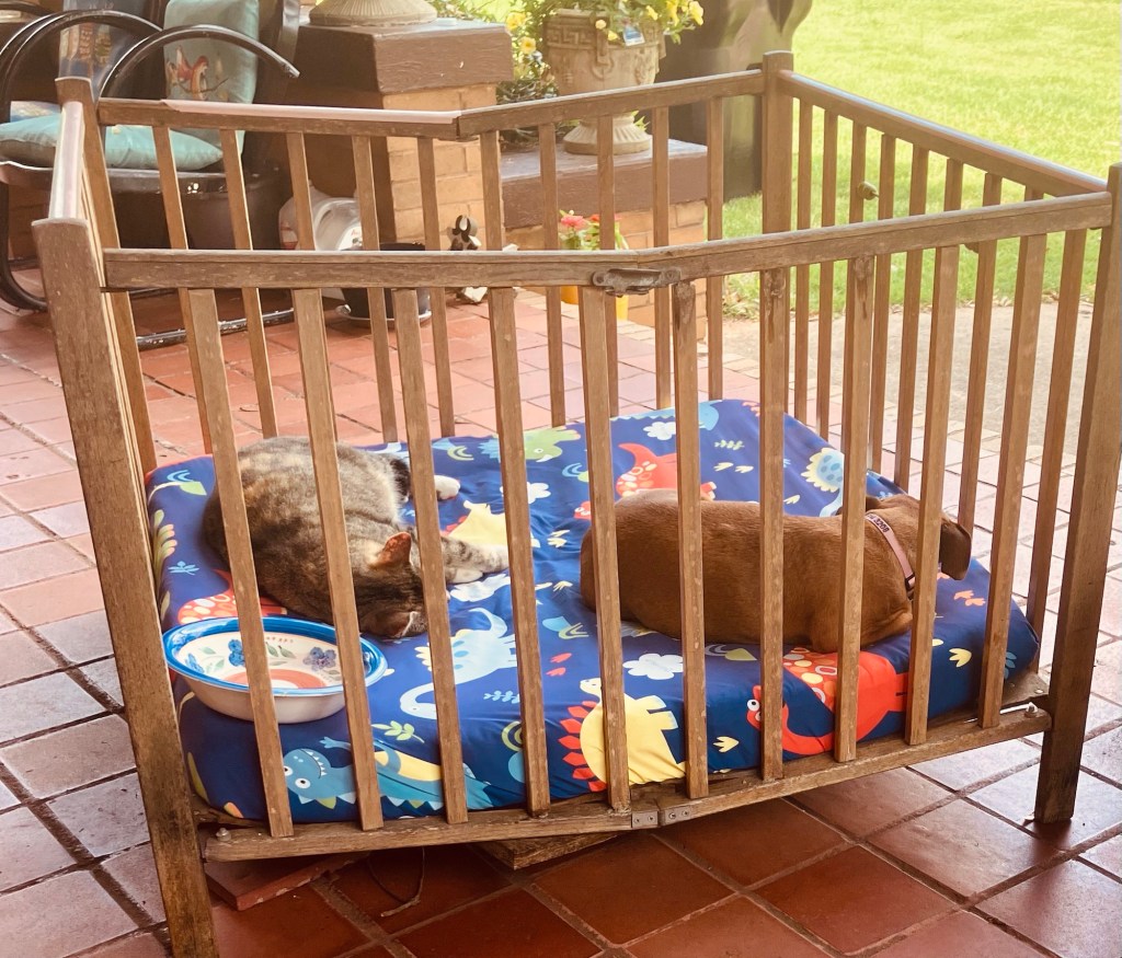 Now my eyes rest on the porch. My two pets, a dog named Penelope and her cat named Kat, sleeping together in the family’s porch playpen. Kat just jumps in whenever she pleases. Two spoiled creatures, one saved from the humane shelter, the other saved from a life of homeless wandering. Pope Francis said, “Let us be protectors of all of Gods Creatures.” And resting on the porch near the playpen is the proverbial 40 pounds of sunflower seeds and two large peace lilies, gifts from friends when Chief died four years ago.