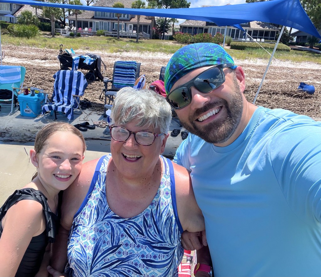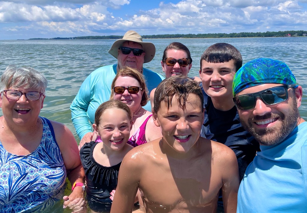 I watched my oldest son and his beautiful family frolic in the ocean, their happy laughter warming my heart. They finally convinced me to be brave and walk out in the ocean with them. Told my granddaughter I would have to sacrifice her to save myself if a shark swam up. Had not walked in the ocean that deep since 1975!