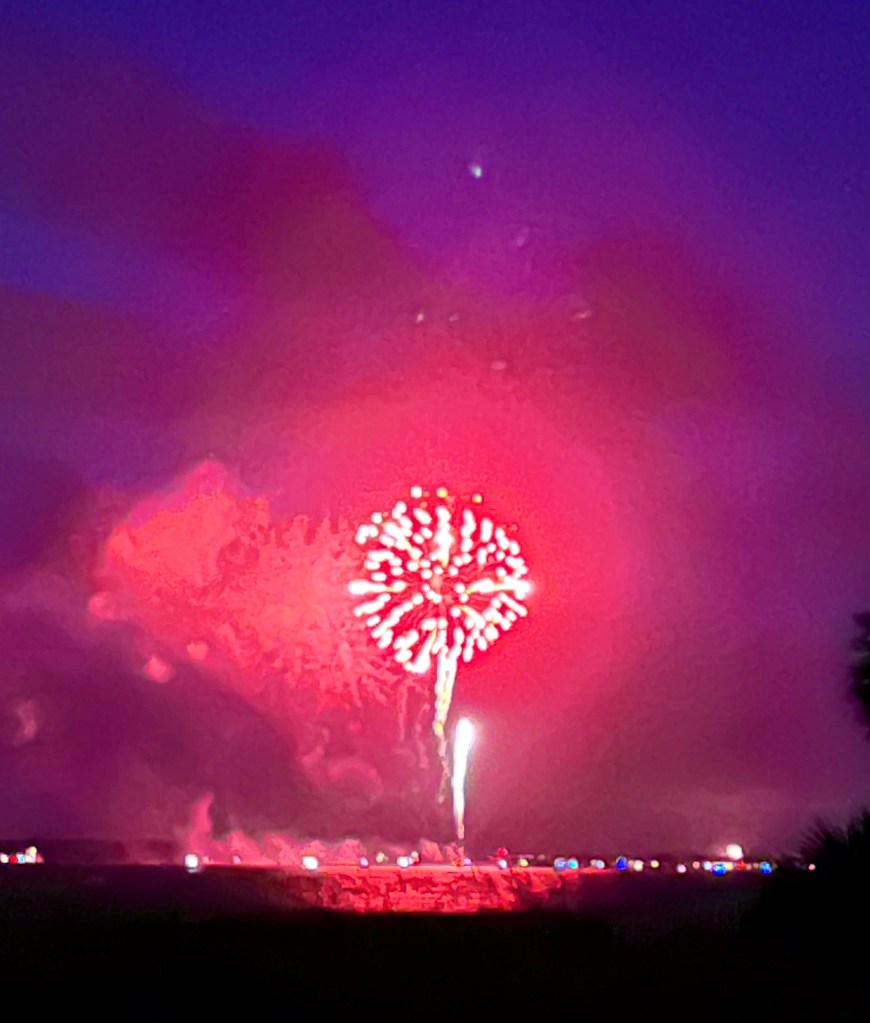 I love this Erna Bombeck quote. “You have to love a nation that celebrates its independence every July 4th, not with a parade of guns, tanks, and soldiers who file by the White House in a show of strength and muscle, but with family picnics where kids throw frisbees, the potato salad gets iffy and the flies die from happiness.” We left our chairs on the beach late afternoon so we can sit after supper and watch the fireworks from Harbor Town. We watched the fireworks on Daufuskie Island last night from our back porch, so beautifully reflected in the glistening water of the ocean.