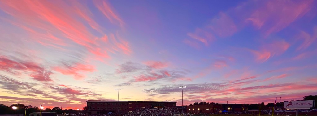 Returning to the porch swing after supper I watched Mother Nature’s watercolor brushes paint the heavens an exquisite pale pink as she blazed a deep watermelon wildfire across the horizon. The fire got out of control, burning the bellies of the gray clouds hot pink. So beautiful but burned out so quickly I had no time for a photograph. My oldest son was watching the sky tonight, too, and sent me a photograph of the sunset from his seat at the football game.