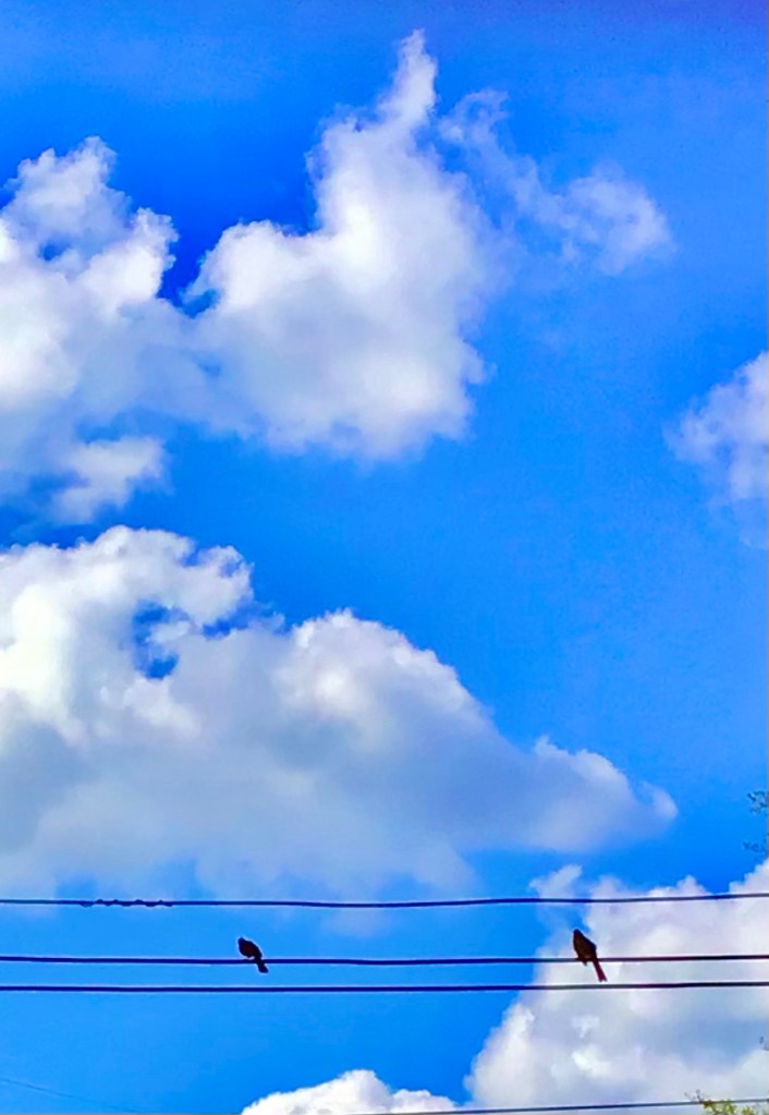 I’m a lucky old girl. I ate my breakfast cinnamon roll and fruit sitting in the swing enjoying starting my day quietly, gifted again with Father Sky’s trademark sketched blue sky I love, a sky full of layers of snow white fluffy clouds holding hands with veils of thin cigar smoke clouds. The larger clouds were kissed Clorox white on their crowns by the sun’s rays. I sat in the swing most of the day watching cardinals, a few finches, and some chickadees visiting the feeders. I’m listening to the woodpecker’s drum solo from high in the old oak. The pink high heel doves are bobbing around under the feeders while Fatty the squirrel, in love with himself, preens in front of the bird feeder camera, stuffing seeds in his mouth and cheeks. I didn’t see the turkey vultures but saw their shadows sailing across the yard, floating over the brick wall next door. Had a small murder of crows create an angry raucous symphony for a while and then they left leaving the songbirds all alone and singing their morning prayers.