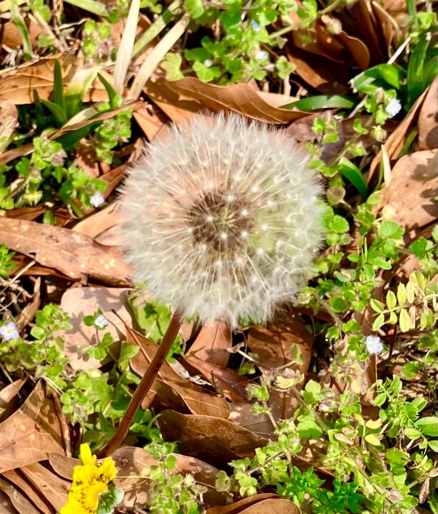 Found some beautiful prizes the Lord left meon my morning walk. The little kestrel had killed a male cardinal and left a pile of down feathers in his wake. I picked up one of the tiny feathers, marveling at its beautiful color and graceful curves, resembling a graceful fragile glass sculpture. As I walked further I noticed a new group of dandelion blooms, just born bright yellow in the morning’s golden sunshine. The older dandelions with their dainty little umbrella seeds were waiting for a wind gust to set them free. The little pink and purple tiny, tiny wildflowers are blooming now, too. And the watercolored pansy blooms…their colorful brush stroked velvet serving as dance stages for the three butterflies and bumblebees visiting the porch bannister urns.