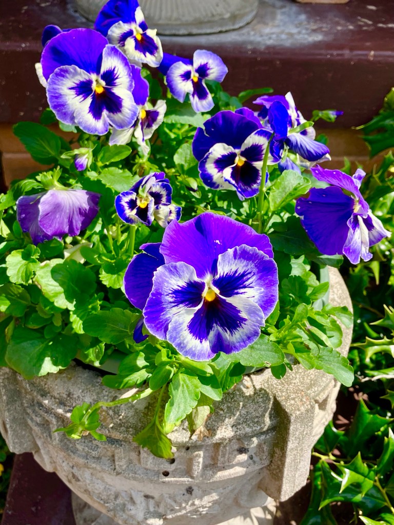 Ate my breakfast perched in the porch swing enjoying a beautiful blue sky full of changing cloudscapes, a yard teeming with purple finches. I saw a few crayon yellow sport coats on some of the finches so the American goldfinches are beginning to pass through here. The pansies are so beautiful standing straight and tall, their faces turned up to the sun waiting for the rain to fall. The sun was hot like a summer afternoon, burning my bare feet, feeding fuel to the thunderstorms headed our way tonight. Penelope is under the bed now so I know the storms are getting close to us.