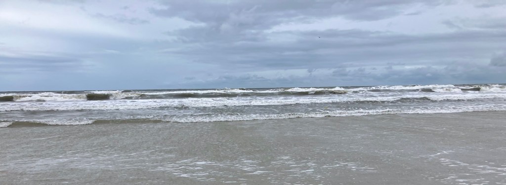 Our travel has ended at the ocean and the rain is gently falling on the beach, now getting heavier. The waves are strong and pounding the beach, dragging the sand back to the deeper waters, leaving little ripples in the beach. The clouds are dark gray and purple centered on the horizon, contrasting with the thick vanilla overcast sky. We’re watching the day’s demise through the windows of a seafood restaurant, the ocean so beautiful in the colors of the evening’s light. Now the day is in a quiet gloaming, dimming in her dusky beauty.